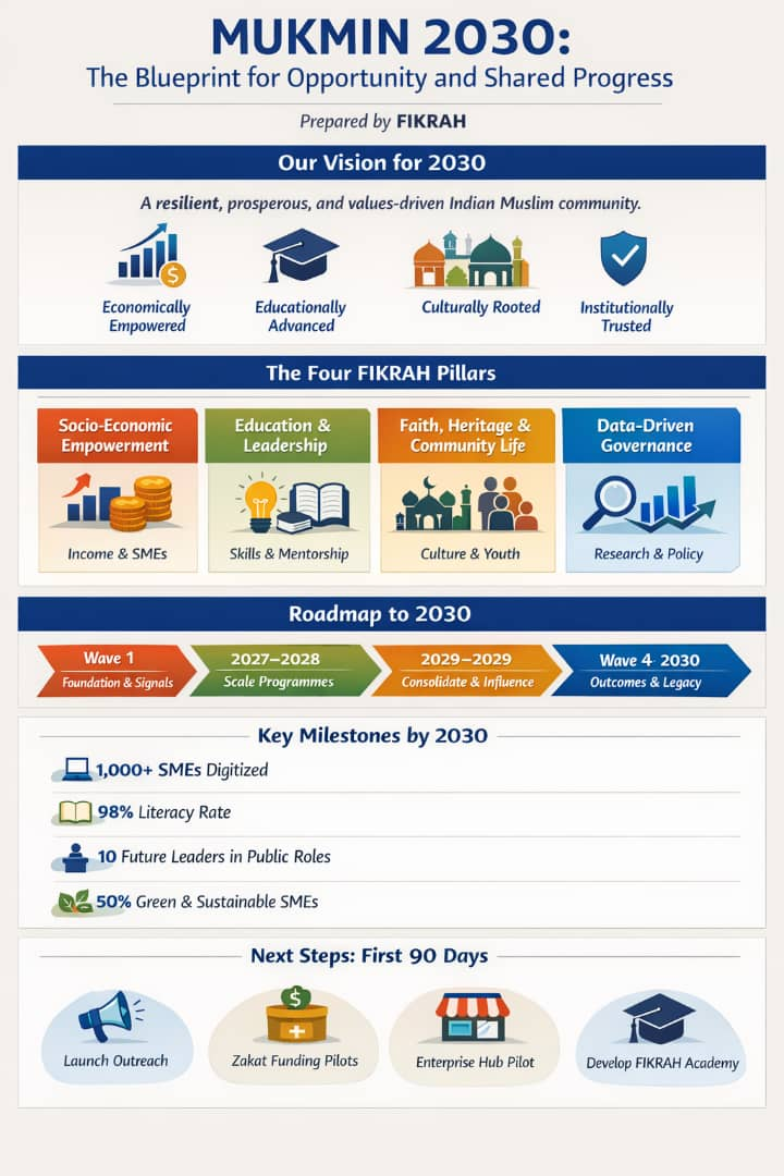 MUKMIN 2030 is the foundational blueprint guiding FIKRAH’s long-term strategy to advance social mobility, economic participation, education, civic engagement, and digital readiness for the Indian Muslim community toward 2030.